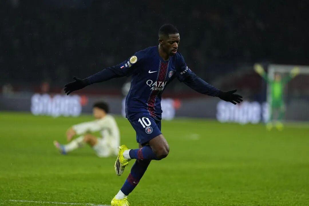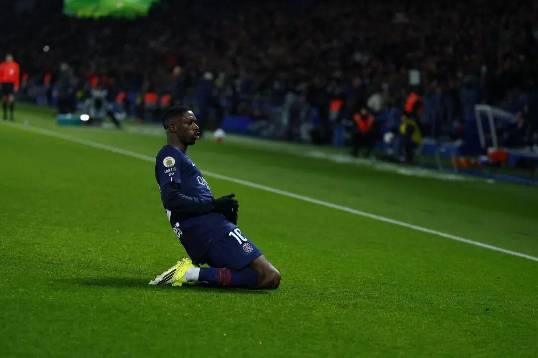 第13分钟,登贝莱禁区外远射打破僵局,1-0!