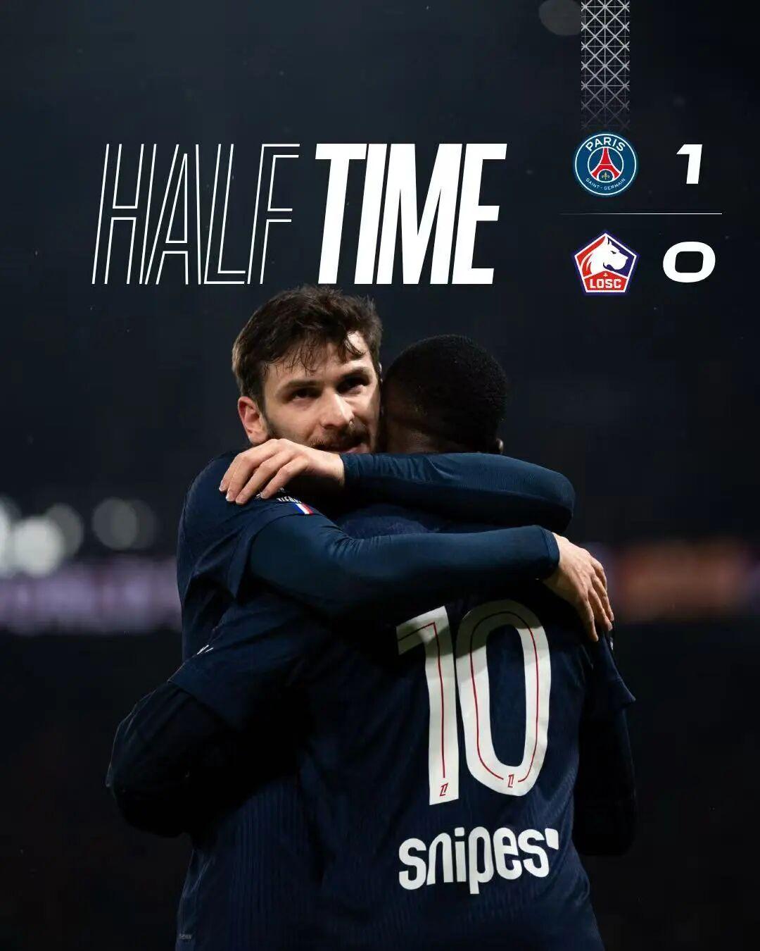 上半场比赛结束,我们暂时以1-0领先里尔。